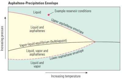 The effect of temperature is critical in the mechanism for paraffin wax precipitation, but its impact on asphaltenes precipitation is less pronounced. As shown in the asphaltene phase envelope, asphaltene stability tends to increase at higher temperatures.