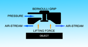 A Bernoulli grip uses airflow to adhere to an object without physical contact.[1] Such grippers rely on the Bernoulli airflow principle. A high velocity airstream has a low static pressure. With careful design the pressure in the high velocity airstream can be lower than atmospheric pressure. This can cause a net force on the object in the direction normal to the side with lower local pressure. A Bernoulli gripper takes advantage of this by maintaining a positive pressure at the gripper face compared to the ambient pressure, while maintaining an air gap between the gripper and the object being held.