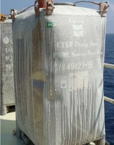 A bisulphite oxygen scavenger tank was found swollen on an offshore platform. The tank lid was open, and the chemical had spilled from the tank lid. There were no injuries and the tank was removed from service.