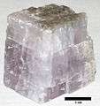 Single calcite crystals display an optical property called birefringence (double refraction). This strong birefringence causes objects viewed through a clear piece of calcite to appear doubled. The birefringent effect (using calcite) was first described by the Danish scientist Rasmus Bartholin in 1669. At a wavelength of ~590 nm calcite has ordinary and extraordinary refractive indices of 1.658 and 1.486, respectively.[6] Between 190 and 1700 nm, the ordinary refractive index varies roughly between 1.6 and 1.4, while the extraordinary refractive index varies between 1.9 and 1.5.[7]