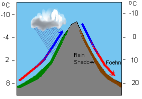 More localized phenomena than global atmospheric movement are also due to convection, including wind and some of the hydrologic cycle. For example, a foehn wind is a type of down-slope wind which occurs in the downwind side of a mountain range. It results from the adiabatic warming of air which has dropped most of its moisture on windward slopes.[5] As a consequence of the different adiabatic lapse rates of moist and dry air, the air on the leeward slopes becomes warmer than equivalent elevations on the windward slopes.