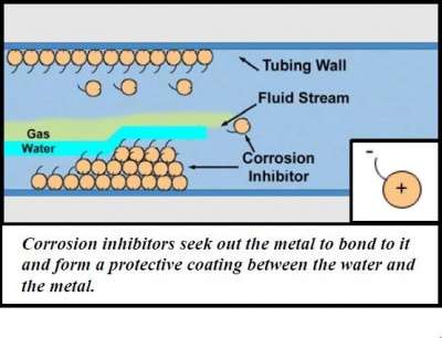 Water soluble inhibitors will dissolve completely in the water phase of the fluid stream. They remain in solution until reaching the tubing wall. At that point, they attach themselves to the surface and form the protective barrier between the water and the metal.