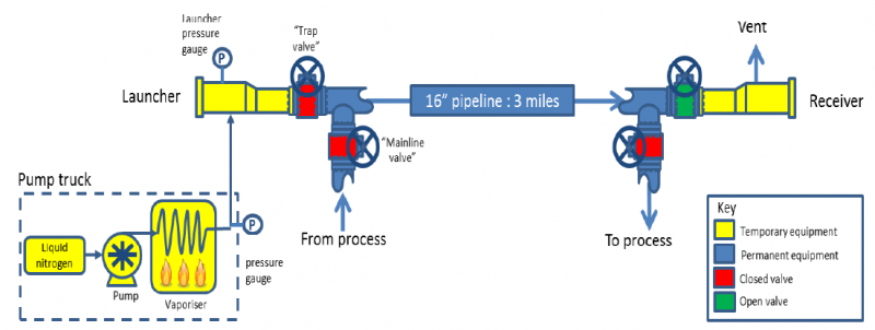 While preparing for a pipeline inspection using an in-line inspection tool (known as a pig), a temporary pig launcher that was attached to a pipeline was over-pressured and failed. Nitrogen pumping equipment was being used to purge the pipeline prior to beginning the in-line inspection. The job was planned, a procedure was in place for the operation, and safety measures were identified and used. However, the valve between the launcher and the pipeline was closed.