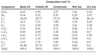 A multicomponent mixture exhibits an envelope for liquid/vapor phase change in the pressure/temperature diagram, which contains a bubble-point line and a dew-point line, compared with only a phase change line for a pure component. The various reservoir types of oil and gas systems based on the phase behavior of hydrocarbons in the reservoir, in