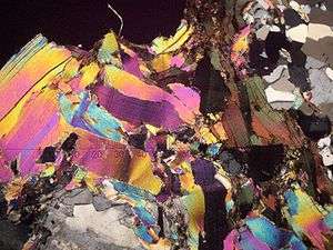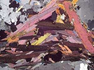 Pleochroism is an optical phenomenon in which mineral grains within a rock appear to be different colors when observed at different angles under a polarizing petrographic microscope.[1]