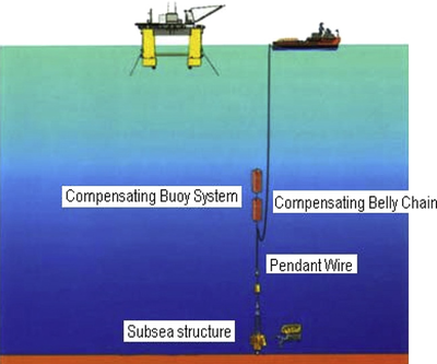 The heave-compensated landing system (HCLS) used by Delmar consists of the following equipment: a compensating buoy system, compensating belly chain, and pendant wire. The buoyancy system suspends the subsea structure, keeping the system close to a neutrally buoyant condition in the vertical direction. The subsea contracture is lowered to the seafloor in a controlled manner by paying out wire from the AHV, which transfers more chain and thus more weight to the buoyancy system. As more chain is added, the added weight overrides the buoyant forces, causing the subsea structure to slowly sink. The length and configuration of the chain are the compensating portion of the system. HCLS has a very good heave compensation effect, but it is difficult and complicated to get the subsea equipment overboard from the barge.