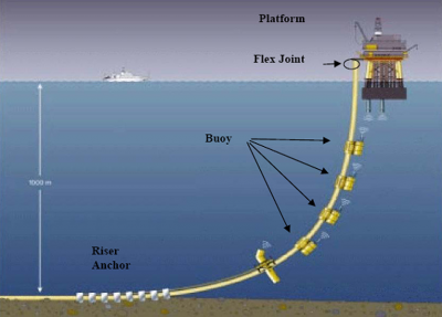 A Steel catenary riser (SCR) is a common method of attaching an offshore pipeline to a deepwater floating oil production platform. The pipeline is extended into a flexible pipeline up to a catenary on the production platform, a free-hanging riser with no intermediate buoys or floating devices.[1] [2]. Relative rotational movements between risers and platform can use a flex joint, stress joint, and pull tube to offset the movement.