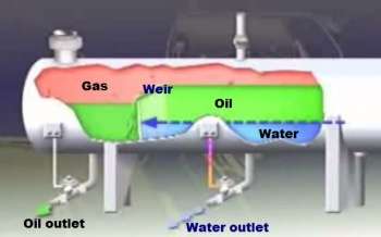 A weir maintains the oil level while an interface controller maintains the water level. The oil spills over the top of the weir, and then a level controller which operates the oil dump valve controls its level. An interface level controller senses the height of oil/water interface. This controller signals the water dump valve to release as much water from the vessel as it is needed to maintain interface at designed height. The gas flows horizontally and exits through a mist extractor to a pressure control valve which maintains constant vessel pressure.