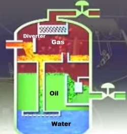 In a vertical three phase separator, flow enters the vessel through the side. As in the horizontal separator, the inlet diverter separates the bulk of the gas. A downcomer is used to transmit the liquid through the oil/gas interface to keep from disturbing the oil skimming action. A chimney equalizes gas pressure between the lower section and the gas section. The spreader, or the downcomer outlet, is located at the oil/water interface. From this point, as the oil rises, any free water separates out from the oil phase. The water droplets flow counter current to the oil. Similarly, the water flows downward and the oil droplets trapped in the water phase rise counter current to the water flow.