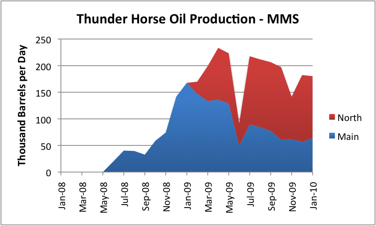 - ↑ Thunder Horse Oil Production in Thousand Barrels per Day, based on data of Minerals Management Services