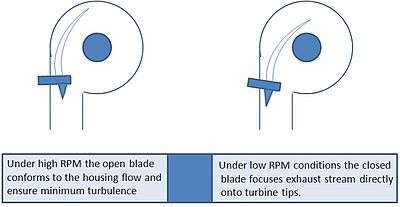 Variable Geometry Turbomachine technology is used in turbocharger of diesel engines, where the turbo has variable vanes which control the flow of exhaust onto the turbine blades. A Variable Geometry Turbocharger[4] has movable vanes which direct the flow of exhaust onto the turbine blades. Actuators are used to adjust the vane angles. Agle of vanes vary hroughout the range of RPM to optimize turbine behaviour. At high engine speed vanes are fully open and the exhaust is fully directed onto the turbine blades. At low engine speeds vanes are almost closed creating a narrow passage for the exhaust. This accelerates the exhaust towards the turbine blades, making them spin faster.