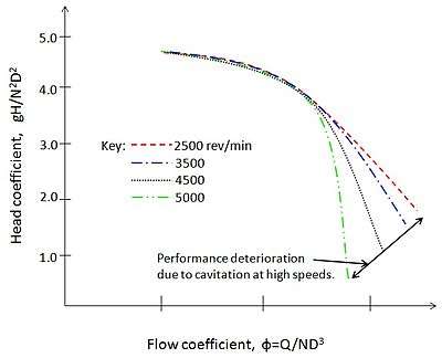 Thus non-dimensional representation is highly advantageous for converging to single performance curve that would otherwise result in multiple curves if plotted dimensionally. Figure 1 shows head characteristics[1] of centrifugal pump versus flow coefficient. Within the normal operating range of this pump, 0.03 <Q/(ND3) < 0.06, the head characteristic curves approximately coincide for different values of speed (2500 <N<5000 rev/min) and little scatter appears may be due the effect of Reynolds number. For smaller flow co-efficient, Q/(ND3) < 0.025, the flow became unsteady but dynamically similar conditions still appear i.e. head characteristic curves still coincides for different values of speed. But at high flow rates deviation from the single-curve are noticed for higher values of speed. This effect is due to cavitation,[2] a high speed phenomenon of hydraulic machines caused by the release of vapour bubbles at low pressures. Thus during off-design operating conditions, i.e. Q/(ND3) < 0.03 and Q/(ND3) > 0.06, the flow become unsteady and cavitations occurs . So to avoid cavitation increase efficiency at high flow rates we resort to Variable Geometry Turbomachine.
